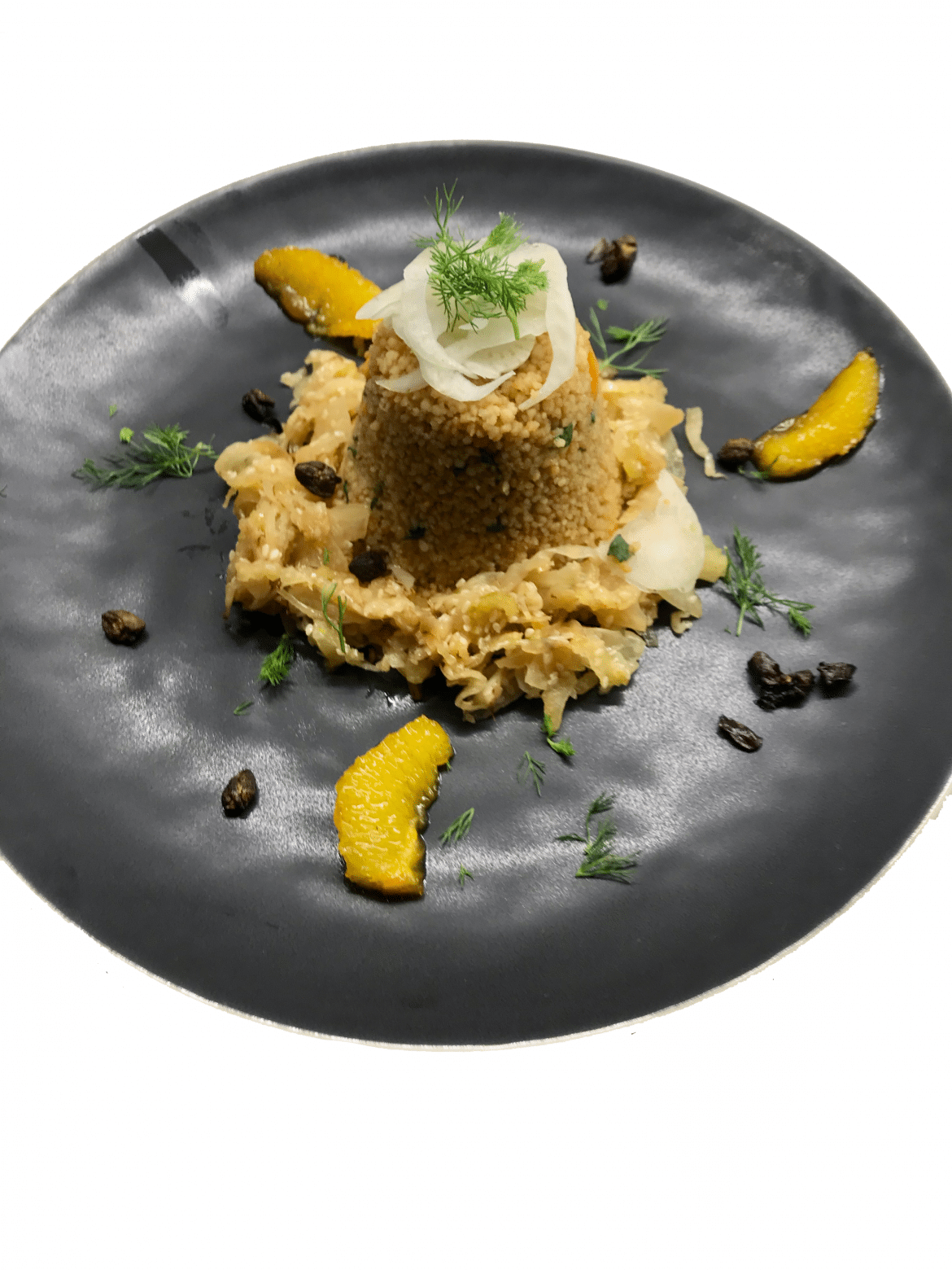 Fruchtig asiatischer Cous-Cous-Salat mit Kapern-Popcorn, karamellisierter Orange, Koriander und Fenchel.