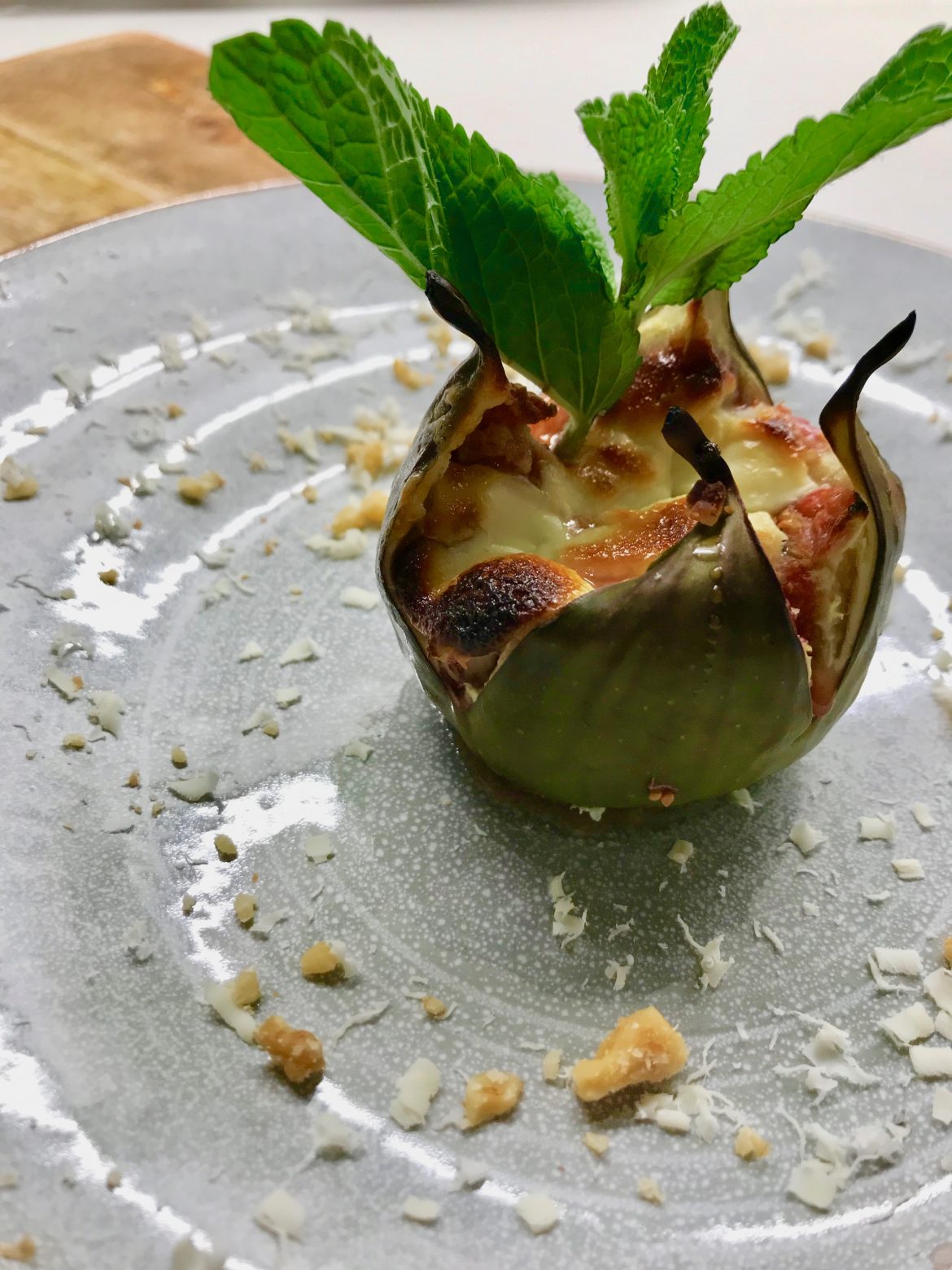 Feigen aus dem Ofen holen und mit Minze, Nüsse und Schokolade füllen.