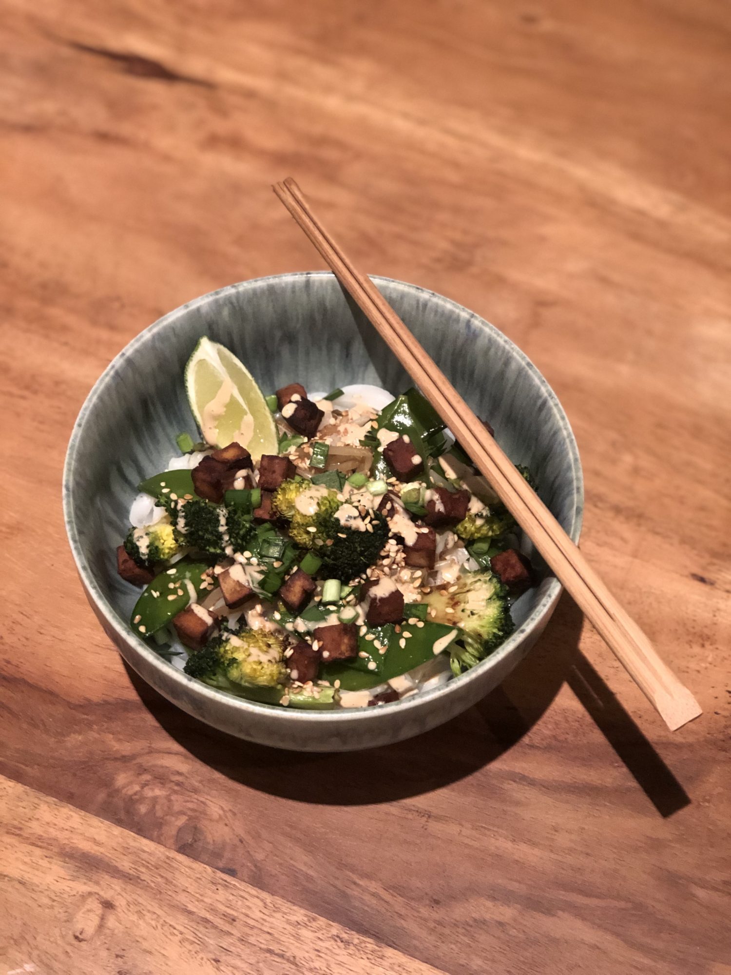 Nun die Nudeln in einer heißen Pfanne anbraten die Soße darüber geben und mit dem Gemüse, Tofu und den Frühlingszwiebel garnieren.